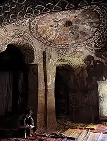 The paintings on the walls and domes of the church are preserved in a reasonable state. Extensive study was undertaken to understand the reason behind this phenomenon.[6] The design of the traceries in the church replicates those found in nearby churches of Gher'alta, such as Debre Tsion church. There are more paintings depicting figures from the Old Testament than from the New Testament. The dry air and lack of humidity have preserved these frescoes in their original perfection.[10] The paintings date back to initial traces of Christianity in Ethiopia and are themed around the nine saints and twelve apostles.[7] The oldest icons are in the form of diptychs and triptychs dating back to the fifteenth century.[11]