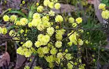 The shrub has an erect to decumbent habit and typically grows to a height of 0.3 to 1 m (1 ft 0 in to 3 ft 3 in)[2] and has ribbed stems that are covered in stiff short hairs. The phyllodes are fine and prickly with a length of 5 to 12 mm (0.20 to 0.47 in) and a width of 0.5 to 1 mm (0.020 to 0.039 in) and have four veins that are usually bent downwards.[3] It blooms between August and November and produces inflorescences with pale yellow flowers.[2] Each inflorescence occurs a one to three spherical flowers on individual stalks found in the leaf axils. After flowering narrow seed pods form that are straight or shallowly curved to with a length of around 6 cm (2.4 in).[3]