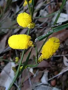 The shrub has a slender rush-like habit and typically grows to a height of 0.2 to 0.5 metres (0.7 to 1.6 ft).[4] It has a multi-stemmed base with narrowly winged upper stems. There are few to no phyllodes which have a linear to narrowly elliptic shape and are 4 to 10 centimetres (1.6 to 3.9 in) in length and have a width of 2 to 6 millimetres (0.08 to 0.24 in).[5] It produces yellow flowers between August and September.[4] The simple inflorescences are supported on glabrous peduncles that are 1 to 4 mm (0.04 to 0.16 in) long. The flower spikes are usually 1 to 3 cm (0.4 to 1.2 in). Seed pods form later that have a linear shape and are 5 cm (2.0 in) in length and 3 mm (0.12 in). The seeds in the pod are 2.5 mm (0.10 in) in length with an oblong shape.[5]