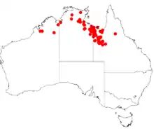 It is native to an area in the eastern Kimberley region of Western Australia where it grows in skeletal soils.[1] Its range extends to the east into the Northern Territory and to far north west Queensland.[2]