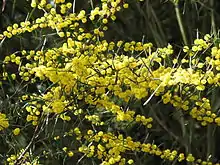 Acacia ausfeldii, commonly known as Ausfeld's wattle or whipstick cinnamon wattle, is a shrub species that is endemic to south-eastern Australia.[2] It grows to between 1 and 4 metres high and has phyllodes that are 2 to 7 cm long and 2 to 6 mm wide. The yellow globular flowerheads appear in groups of two or three in the axils of the phyllodes in August to October, followed by straight seed pods which are 4 to 9 cm long and 2 to 4 mm wide.[3]