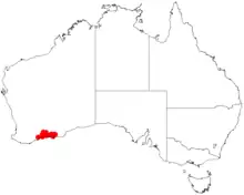 It is native to an area in the Goldfields-Esperance region of Western Australia where it is commonly found growing in clay loam soils often containing lateritic gravel.[1] The range of the species is from around Ravensthorpe in the west to around Kundip in the south and out to Munglinup in the east and also Scaddan–Wittenoom Hills area as a part of open scrubland communities.[2]