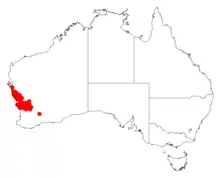 It is native to an area in the Mid West and Wheatbelt regions of Western Australia. The plant is often situated in a variety of habitats including low hills, along the banks of creeks, around areas of saline drainage, flats and road verges where it grows in gravelly sandy-clay or loamy soils found around outcrops of granite or laterite.[2]