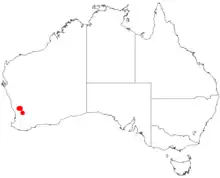 It is native to an area in the Wheatbelt region of Western Australia growing in sandy to sandy-loamy soils often over or around areas of laterite.[1] The distribution of the shrub is limited to a small area from between Wongan Hills and Piawaning as a part of sandy heathland communities where it is often associated with Melaleuca uncinata.[2]