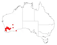 It is native to an area in the Peel and Wheatbelt regions of Western Australia where it is commonly situated amongst granite outcrops growing in sand, clay or clay-loam soils.[1] It is found around the Jarrahdale in the west to around Manmanning to around Hyden in the east as a part of scrubland or open woodland communities.[2]