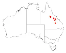 It is endemic to the eastern-central parts of Queensland where it has a disjunct distribution. It is found as far north as the headwaters of Torrens Creek catchment in the White Mountains where it is often situated in sandstone gorges but is also found further to the south around 100 km (62 mi) north of Clermont where it grows in broken country.[1]