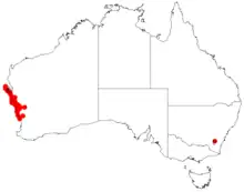 It is native to an area along the west coast in the Wheatbelt and Mid West regions of Western Australia situated on near-coastal cliffs and dunes growing in sandy or loamy soils usually over or around limestone or sandstone.[1] The range of the plants extends along the coast from around Ledge Point in the south up to Tamala Station and Dirk Hartog Island in Shark Bay in the north. It is often part of mallee groves or shrubland communities.[2]