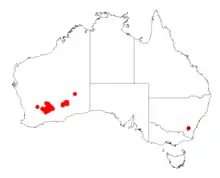 It is native to an area in the Wheatbelt and Goldfields-Esperance regions of Western Australia where is often situated on sandplains growing in sandy lateritic soils.[1] It is distributed from around Southern Cross and Coolgardie area in the west to around Queen Victoria Spring and the Streich Mound which is located about 200 km (120 mi) to the north east of Kalgoorlie.