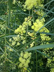 The shrub has a weeping habit and typically grows to a height of 2 to 5 metres (6.6 to 16.4 ft)[4] with a crown width of 2 to 5 m (6.6 to 16.4 ft).[1] Young plants are glabrous and have greenish coloured bark that later becomes brown in colour as the plant ages.[3] The slender grey-green foliage has pink-red tips of new growth.[1] The long slender phyllodes are arranged alternately and have a prominent single vein running lengthwise[3] and grow up to 10 centimetres (3.9 in) in length.[5] It produces yellow flowers from March to September.[4] The flowers are arranged into small spherical clusters that are found in short compound clusters in the phyllode forks. The flower heads have a diameter of 5 to 8 millimetres (0.197 to 0.315 in) and contain 12 to 17 pale to lemon yellow flowers.[6] The thin leathery[6] light brown[7] seed pods that form following flowering are elongated and flat usually 5 to 13 centimetres (2.0 to 5.1 in) in length and 6 to 12 mm (0.236 to 0.472 in) wide.[3] The pods contains hard black ellipsoidal shape seeds that are 6 mm (0.236 in) in length and half as wide.[7]