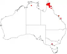 It is endemic to Queensland in the northern part of Cape York Peninsula where it is quite common. It is found around the Coleman River in the south up to the catchment areas for the Wenlock River and Olive Rivers in the north. It is mostly situated along the river banks and seasonal drainage systems along the eastern side of the Peninsula where it is usually a part of rainforest communities.[1]