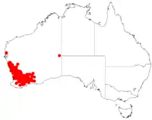 It is native to Mid West, Wheatbelt, Great Southern and Goldfields-Esperance regions of Western Australia where it is found growing in yellow sandy soils. The range of the shrub extends from around Northampton in the north down to around Cranbrook in the south.[2] It extends eastwards as far as to just south west of Coolgardie and the Frank Hann National Park where it is usually situated on sand-plains as a part of heathland or scrubland communities.[3]