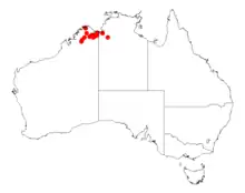 It is found in the Kimberley region of Western Australia and the western part of the top end of the Northern Territory. The range of the pant extends from around Kalumburu in the north west down to around the Gibb River Road in the south west and across into the Northern Territory to around Blunder Bay on the Victoria River in the north east to around the Keep River National Park in the east. It can be situated on flats, rocky hills or gorges along watercourses growing in gravelly or sandy soils over or around quartzite or sandstone as a part of savannah woodland or savannah grassland communities where it is usually associated with spinifex.[1]