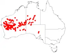 It is native to the Pilbara, Mid West and Goldfields regions of Western Australia.[2] where the bulk of the population is found from around Gascoyne Junction in the west to around Yalgoo and then extending east into the Northern Territory and South Australia where it is found in many different types of habitats but usually situated on stony plains growing in sandy loam, clay or sandy soils commonly over hardpan as a part of mixed open Mulga shrubland or woodland communities.[1]