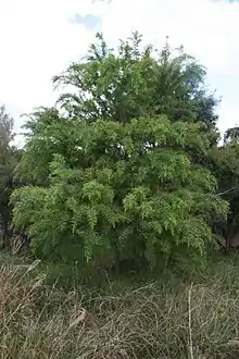 Acacia pubescens grows as a shrub to small tree anywhere from 1 to 5 m (3 to 20 ft) high. The smooth bark is grey-brown in colour, and the branches can have a slightly drooping or weeping habit. Like all wattles, the downy wattle has leaf-like structures known as phyllodes which are compound (pinnate) and measure 1.5–6.5 cm (0.59–2.56 in) in length with 3 to 12 pairs of smaller "leaves" or pinnae, each 0.5–2.5 cm (0.20–0.98 in) long, and themselves composite - composed of 5 to 20 pairs of pinnules.