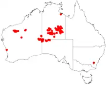 It is native to the north western margins of the Simpson Desert in the Northern Territory in the north down to around the Musgrave and Tomkinson Ranges of South Australia. It is also found in parts of Western Australia. In South Australia it is situated along dry creeks and river beds.[1] In an area in the desert in the Central Ranges of the eastern Goldfields it can be found growing in red sand, stony sand, loamy or clay soils.[2]