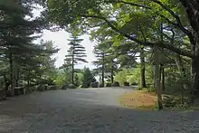 From 1915 to 1940, the wealthy philanthropist John D. Rockefeller Jr. financed, designed, and directed the construction of a network of carriage roads throughout the park.[9] He sponsored the landscape architect Beatrix Farrand, whose family owned a summer home in Bar Harbor named Reef Point Estate, to design the planting plans for the carriage roads (c. 1930).[37] The network originally encompassed about 57 miles (92 km)[8] of crushed stone carriage roads with 17 stone-faced, steel-reinforced concrete bridges (16 financed by Rockefeller), and two gate lodges—one at Jordan Pond and the other near Northeast Harbor.[38] About 45 miles (72 km) of carriage roads are maintained and accessible within park boundaries. Granite coping stones along carriage road edges act as guard rails; they are nicknamed "Rockefeller's Teeth."[9] The carriage roads are open from the end of the spring mud season, generally in late April, through the summer, autumn, and winter months, until the following spring thaw causes another closure in March to prevent damage to the gravel surface.[39][40]