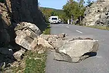 The 27-mile (43 km) Park Loop Road leads to many scenic viewpoints along the coast, through forests and to the top of Cadillac Mountain.[13] The road traverses the eastern side of Mount Desert Island in a one-way, clockwise direction from Bar Harbor to Seal Harbor, passing features such as the Tarn (a pond), Champlain Mountain (location of a popular, exposed cliffside trail named Precipice),[15][16][17] the Beehive (another, smaller mountain), Sand Beach (a saltwater swimming area), Gorham Mountain, Thunder Hole (a crevasse into which waves crash loudly), Otter Cliff, Otter Cove, Seal Harbor, Jordan Pond, Pemetic Mountain, the Bubbles, Bubble Rock, Bubble Pond, Eagle Lake, and the side road to the summit of Cadillac Mountain. Some of the island's west side features include Echo Lake and beach (a designated freshwater swimming area), Acadia Mountain, Beech Mountain, Long Pond, and Seal Cove Pond. Bass Harbor Head Light is situated atop a cliff on the southernmost tip of the west side of the island.[6] Baker Island Light and Bear Island Light are the other two lighthouses managed by Acadia.[18]