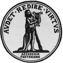 The Accademia Pontaniana was the first academy in the modern sense, as a learned society for scholars and humanists and guided by a formal statute.[1] Patronized by Alfonso V of Aragon, it was founded by the poet Antonio Beccadelli in Naples during the revival of classical learning and later led by Giovanni Pontano who gave it a more official character to the meetings.[2]