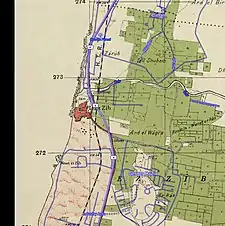 The main economic sectors in the village were in fishing and agriculture, particularly fruit cultivation, which included bananas, citrus, olives, and figs. The town held four olive presses: two mechanized and two animal-drawn. Between 1927 and 1945, the village's annual fish catch was 16 metric tons.[37] In the 1945 statistics, the population of Az Zeeb was 1,910, all Muslims, with a total land area of 12,607 dunams.[10] Of this, 2,973 dunams were used for citrus and bananas; 1,989 dunums were irrigated or used for orchards; 4,425 were for cereals;[42] while 62 dunams were built-up (urban) areas.[43]