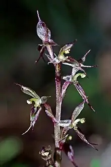 Acianthus exsertus, commonly known as gnat orchid[2] or large mosquito orchid,[3] is a species of flowering plant in the orchid family Orchidaceae and is endemic to eastern Australia. It is a terrestrial herb with a single, heart-shaped leaf and up to 25 small, fine, dark brown flowers with pinkish and purplish markings and is found growing in sheltered places in forests in Queensland, New South Wales the ACT and Victoria.