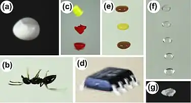 Although originally static, acoustic levitation has progressed from motionless levitation to dynamic control of hovering objects, an ability useful in the pharmaceutical and electronics industries.[6][7] This dynamic control was first realised with a prototype with a chessboard-like array of square acoustic emitters that move an object from one square to another by slowly lowering the sound intensity emitted from one square while increasing the sound intensity from the other, allowing the object to travel virtually "downhill".[7] More recently the development of phased array transducer boards have allowed more arbitrary dynamic control of multiple particles and droplets at once.[8][9][10]