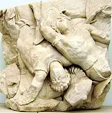 A relief on the interior Telephus frieze of the Pergamon Altar depicting Ajax killing Actaeus and Heloros.