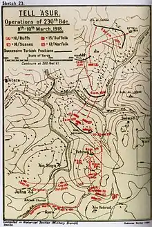 Meanwhile, infantry from the 53rd, 74th and 10th Divisions advanced north up both sides of the Jerusalem to Nablus road from Kefr Malik to Nebi Saleh cutting off all tracks and roads leading to the lower Jordan Valley.[1][3] The 53rd (Welsh) Division's objective; the capture of Tell 'Asur, was assigned to the 158th Brigade. The Tell was a very valuable observation post with views extending north to the hills of Galilee with Mount Hermon in the background 90 miles (140 km) away, in the east and south-east to Gilead, Moab and most of the Dead Sea, in the south over the Mount of Olives to the heights of Hebron and west to the Mediterranean from south of Jaffa to north of Caesarea. It was captured by the 5th Battalion, Royal Welch Fusiliers about 09:30 after a heavy bombardment by the 91st Heavy Battery but the position was far from secure being subjected to a successful counter-attack shortly after, but the 6th Battalion, Royal Welch Fusiliers, drove them off. Four unsuccessful attempts by Ottoman forces were made to regain this hill.[8]