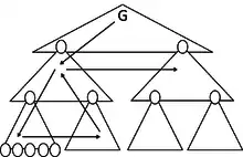 Regular feedbacks are essential for Hackers model to guarantee purposeful behaviour. He talks about control loops. At the lowest level the first triangle shows the classical circular processes. G is a goal or sub-goal and T1-T4 describe the single operations, transformations or actions which are needed to reach the goal.[7] Although the number of operations shown are just an example. Depending on many aspects, like complexity of the task, the number of operations on each level can vary.[7]