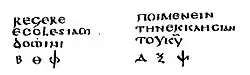 - "Church of God": translated from the Greek phrase ἐκκλησίαν τοῦ θεοῦ, ekklēsian tou Theou.[21] Textus Receptus has τοῦ Θεοῦ, tou Theou, whereas many uncials have τοῦ Κυρίου, "of [the] Lord" but the phrase ἐκκλησία τοῦ Κυρίου occurs nowhere else in Paul's writings, while the phrase ἐκκλησία τοῦ Θεοῦ occurs ten times in Pauline epistles.[21] Both the Codex Vaticanus (B; 03) and the Codex Sinaiticus (א; 01), regarded as two oldest manuscripts, have Θεοῦ (Θυ), as well as the Latin Vulgate and the Syriac versions.[21] The early Church Fathers Ignatius (in his Epistle to the Ephesians) and Tertullian use the phrase, "the blood of God," which seems to have been derived from this passage.[21]