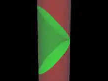 The adjacent image represents the "half-space" region of anti-de Sitter space and its boundary. The interior of the cylinder corresponds to anti-de Sitter spacetime, while its cylindrical boundary corresponds to its conformal boundary. The green shaded region in the interior corresponds to the region of AdS covered by the half-space coordinates and it is bounded by two null, aka lightlike, geodesic hyperplanes; the green shaded area on the surface corresponds to the region of conformal space covered by Minkowski space.