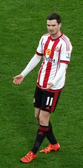On 24 August 2012, his hometown team Sunderland signed Johnson on a four-year-contract for £10 million.[51] Sunderland manager Martin O'Neill said "Adding quality players to the squad has been our main aim this summer and Adam certainly fits that bill. He has terrific ability, great delivery and I'm sure he is a player who will excite the fans. I couldn't be more delighted to have him at the club."[52] On 28 August, Johnson made his first appearance for Sunderland in a 2–0 win over League Two team Morecambe in the League Cup second round, assisting both goals at the Stadium of Light.[53] He scored his first goal for the club on 10 November, opening the scoring in a 1–2 defeat away to Everton.[54] He scored the only goal of a win over former club Manchester City at home on 26 December. In April 2013, against Sunderland's fierce rivals Newcastle at St James' Park, Johnson's picked up the ball on Sunderland's right and cut inside before sending a curling effort past Newcastle goalkeeper Rob Elliot with his left foot to score.[55]