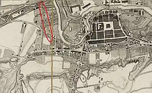 A 1800 Map of Bromberg highlights a road parallel to the Brda river in the area,[1] with less than a dozen plots built.
