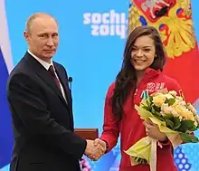 Sotnikova won the gold medal in the ladies' individual event with an overall score of 224.59 points, becoming one of the youngest Olympic figure skating champions. She was second behind the defending Olympic and reigning World Champion Kim Yuna by 0.28 point after the short program, but overtook Kim by winning the free skate.[21][22][23] However, Sotnikova's victory was controversial due to allegations of judges' impartiality and criticisms of the scoring system.[24][25][26] Questions over the judges, the judging system, and the anonymity of scores were also raised in the press.[27] In the press conference after her win at the Olympics, Sotnikova stated that she became "more motivated to win the singles competition" after not being chosen to compete in the earlier team competition.[20][28][29][30] She was awarded the Order of Friendship by Vladimir Putin on 24 February 2014.[31] Sotnikova did not participate in the 2014 World Championships held in Saitama, Japan.