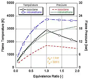 Assuming initial atmospheric conditions (1 bar and 20 °C), the following table[1] lists the flame temperature for various fuels under constant pressure conditions. The temperatures mentioned here are for a stoichiometric fuel-oxidizer mixture (i.e. equivalence ratio φ = 1).