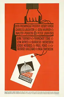 The film was adapted for the screen by Wendell Mayes and was directed by Otto Preminger. The ensemble cast features Henry Fonda, Charles Laughton, Don Murray, Walter Pidgeon, Peter Lawford, Gene Tierney, Franchot Tone, Lew Ayres, Burgess Meredith, Eddie Hodges, Paul Ford, George Grizzard, Inga Swenson, Betty White and others.
