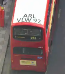 Vehicles operating London Buses services carry roof markings, as shown in the image opposite. The first three letters denote the operator (ARL is Arriva London) and the remaining letters and numbers are the fleet number (VLW 92), which also appears on the front and rear of the vehicle.