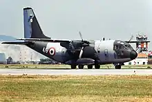 The G.222 is a twin turboprop-engine tactical military transport aircraft, and is designed to be capable of transporting equipment or troops in combat zones and operating with minimal ground support.[12] Early production aircraft were exclusively fitted with the General Electric T64-GE-P4D turboprop engine, the licence-built Rolls-Royce Tyne was made available as an alternative powerplant for the type from 1980 onwards, while the Allison T56 was another proposed powerplant for the type.[7][9] Due to features such as double-slotted flaps, stacked brakes, and reversible propellers,[19] the G.222 has excellent short landing capabilities and is able to land in as little as 1,800 feet.[20] It was designed to be integrated with the larger, commonplace Lockheed C-130 Hercules.[5]