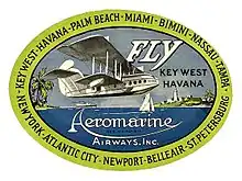 It was reorganized as Aeromarine Airways in spring of 1921 with Inglis Moore Uppercu, a New York City Cadillac dealer as its president. Aeromarine enjoyed many firsts - the first U.S. international air mail service and first scheduled U.S. international passenger service (Key West to Havana, November 1, 1920); first total-service U.S. airline (passenger, mail, express cargo); first in-flight movie (Chicago, August 1921); first airline baggage label (1921); and the first U.S. airline ticket office (Cleveland, July 1922).[5] Its slogan was "Speed Safety Comfort".[6] The overseas flights in Felixstowe F5L flying boats named the Nina, Pinta, and Santa Maria brought passengers to popular destinations that still allowed drinking at the start of Prohibition.[7] The new metal-hulled, six-passenger Aeromarine AMC was placed into service in 1924 but operated for only a short time before service ceased.[8]