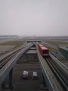 Part of the train track goes underground to cross the taxiway.[4] The ride between the Main Terminal Building and Satellite Terminal A takes about 2.5 minutes.[5]
