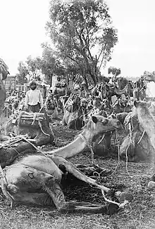 Afghan cameleers in Australia, also known as "Afghans" (Pashto: افغانان) or "Ghans" (Pashto: غانز), were camel drivers who worked in Outback Australia from the 1860s to the 1930s. Small groups of cameleers were shipped in and out of Australia at three-year intervals, to service the Australian inland pastoral industry by carting goods and transporting wool bales by camel trains. They were commonly referred to as "Afghans", even though the majority of them originated from the far western parts of British India, primarily the NWFP and Balochistan (now Pakistan), which was inhabited by ethnic Pashtuns and Balochs. Nonetheless, many were from Afghanistan itself as well. In addition, there were also some with origins in Egypt and Turkey.[1] The majority of cameleers, including cameleers from British India, were Muslim, while a sizeable minority were Sikhs from the Punjab region. They set up camel-breeding stations and rest-house outposts, known as caravanserai, throughout inland Australia, creating a permanent link between the coastal cities and the remote cattle and sheep grazing stations until about the 1930s, when they were largely replaced by the automobile.[1] They included members of the Pashtun, Baloch, and Sindhi ethnic groups from south-central Asia (present-day Iran, Afghanistan and Pakistan); others from the Punjabi, Kashmir, and Rajasthan regions of the Indian subcontinent; as well as people from Egypt, Iraq, Syria, and Turkey. They provided vital support to exploration, communications and settlement in the arid interior of the country where the climate was too harsh for horses. They also played a major role in establishing Islam in Australia, building the country's first mosque at Marree in South Australia in 1861, the Central Adelaide Mosque (the first permanent mosque in Adelaide, still in use today), and several mosques in Western Australia.