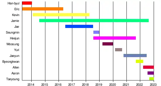 Jaeyun graduated from the show on June 21.[23] He was replaced by former NU'EST member Aaron Kwak beginning from the July 26th episode.[24] After hosting for over seven years, Jamie departed the show following the August 16th episode to focus on her music career and to work on her new album.[25] She was replaced by Cravity's Taeyoung beginning from the September 6 episode.[26]