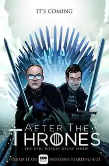 After the Thrones is an American live television aftershow that premiered on April 25, 2016, and ended on June 28, 2016. It was hosted by Andy Greenwald and Chris Ryan who discussed episodes of the HBO television series Game of Thrones. The talk show was executive produced by Bill Simmons and Eric Weinberger. Greenwald and Ryan previously hosted a podcast version of the show titled Watch the Thrones on Simmons' Grantland website. A similar talk show called Thronecast aired on British channel Sky Atlantic, which also discussed episodes of Game of Thrones.