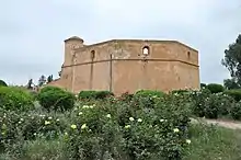 Muhammad IV, for his part, extended the Agdal enclosure further south, creating the Agdal Barrani section which extends south of the Dar al-Hana, thus finalizing the Agdal's present-day outline.[2][8] The outer western walls of the Agdal were also partly rebuilt in his time following an attack by the Rehamna tribe, whom the sultan afterwards ordered to repair the damage. At the same time, a small bastion fort was added here on the Agdal's western perimeter, known as the Sqallat al-Mrabit, to help defend it in the future.[5]: 529 In 1862-63 Muhammad also built a new pleasure kiosk in the middle of the Jnan ar-Redwan, the garden area in the northwestern corner of the enclosure.[3][5]: 529