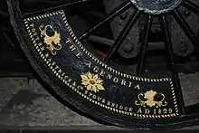 The boiler had two safety valves, one of which was inaccessible to the enginemen. An unusual feature of the locomotive are the balance weights in the driving wheels, which also act as decorative nameplates.[9]