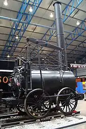 The locomotive, tender and water weighed around 11 tons according to an exhibition catalogue of 1884.[6] It had four coupled wheels of 4 ft in diameter and two cylinders of 8.5 inches diameter by 36 inches stroke.[7] The cylinders acted through grasshopper beams, generally an unusual feature, but used on all of Foster, Rastrick's locomotives. Agenoria was probably the first locomotive to use mechanical lubrication for its axles. The flued boiler was 10 feet in length and four feet diameter. The grate was contained in a furnace tube of 29 inches diameter, which branched into 2 flues which were each of 18 inches (457 mm) diameter.[8] The locomotive featured an extremely tall chimney of height 14 feet 4 inches (4,369 mm).