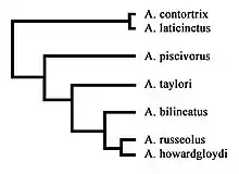 Recent molecular studies[16][17][18] have produced strong evidence indicating that pitvipers made a single invasion into the New World, presumably via the Bering Land Bridge in the early Tertiary or late Cretaceous, with a subsequent divergence resulting in a northern temperate group (including Agkistrodon, Crotalus, and Sistrurus) and a Neotropical group.[17]: 93 p. Of the Old World pitvipers, Gloydius appears to be phylogenetically close to the New World pitvipers, but the exact relationship between Old World and New World pit vipers is not fully resolved at this time.[18]: 103 p. The molecular evidence indicates the genus Agkistrodon is a monophyletic group, meaning they all share a common ancestor, and suggest that copperheads, (Agkistrodon contortrix) are the most basal (ancestral) living lineage of the genus, with the cottonmouths (Agkistrodon piscivorus) basal to Taylor's cantil (A. taylori), and A. taylori basal to the remaining cantils of Latin America.[16]: 416 p.