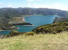 Água de Pau Massif is a stratovolcanic complex, located in central part of the island of São Miguel, in the Portuguese archipelago of the Azores. More recognizable for the Lagoa do Fogo at its centre, the volcanic complex includes centuries of geomorphological structures that include lava domes, cones and encrusted lava flows that have marked its history from, the last, 45,000 years BC.