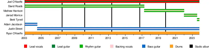 Harrison was replaced by Jarrad Morrice on rhythm guitar and backing vocals during mid-2022.[57][58] The band were working on a new album expected in 2023.[59] By September 2023 Morrice was replaced on rhythm guitar by Brett Tyrrell (ex-Thunderstruck).[60][61]