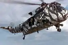Ground camouflage is used to delay visual acquisition from the air of an aircraft that is on or near the ground. Light sand has been used for aircraft used over deserts, blues and greys for aircraft over the sea, and greens and browns for aircraft that are expected to operate in forested areas.[31] However, a camouflaged aircraft either on the ground or flying low over the ground in bright sunlight remains vulnerable to being detected from above because of its own shadow cast on the ground.[32] This can reduce an aircraft's camouflage effectiveness at altitudes up to 3,000 feet (910 m), particularly if the ground surface is pale and relatively uniform.[32] Helicopters are often painted in ground camouflage, sometimes in regional or seasonal forms such as snow camouflage.[33] Fixed-wing aircraft, too, are occasionally painted with snow camouflage, as for example on Soviet fighters[34] and Luftwaffe Stukas on the Eastern Front in winter,[35] in Swedish trials in 1970,[36] and RAF Jaguars on exercise in Norway.[37][lower-alpha 1]