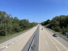 The Airport Connector begins at the entrance to Harrisburg International Airport in Lower Swatara Township, Dauphin County, where the roadway continues south to loop around the terminal. Past the airport, the road passes over Norfolk Southern's Royalton Branch and Amtrak's Keystone Corridor railroad lines before immediately reaching a partial cloverleaf interchange with PA 230. From this point, the four-lane freeway heads north-northeast through wooded areas adjacent to homes and farms, crossing over the Pennsylvania Turnpike (I-76) without an interchange as it curves north-northwest. The freeway passes more areas of farms and woods before it reaches its terminus at a trumpet interchange with PA 283. The interchange also provides partial access between PA 283 and PA 441, but the Airport Connector has no connection to the latter route.[2]